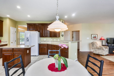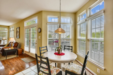 - Adjacent to the breakfast area on the back wall is a two panel French door with bidirectional cellular blinds and a transom above the door that opens to the updated Trex deck with stairs to the backyard