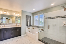 - Tub/shower has ceramic surround that matches the double vanity back splash