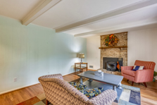 - Family room has a raised hearth brick wood-burning fireplace with a wood stove insert