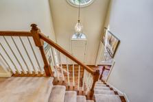 - To the left are the wide hardwood stairs to the bedroom level with runner and the
