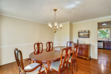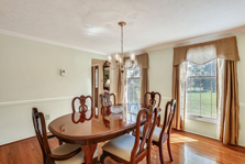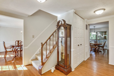 - On the left is the dining room which opens to the kitchen and carpeted stairs to the bedroom level