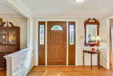 - Updated fiberglass door with half moon cut glass window and two matching cut glass sidelights that are framed by matching coach lights